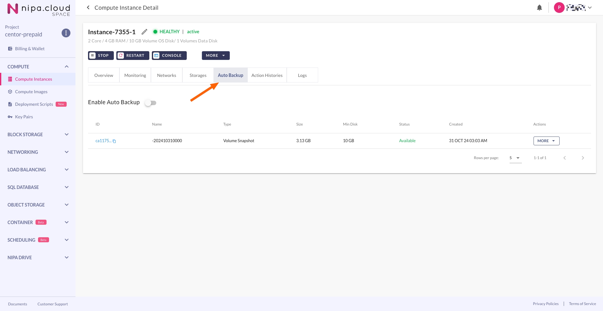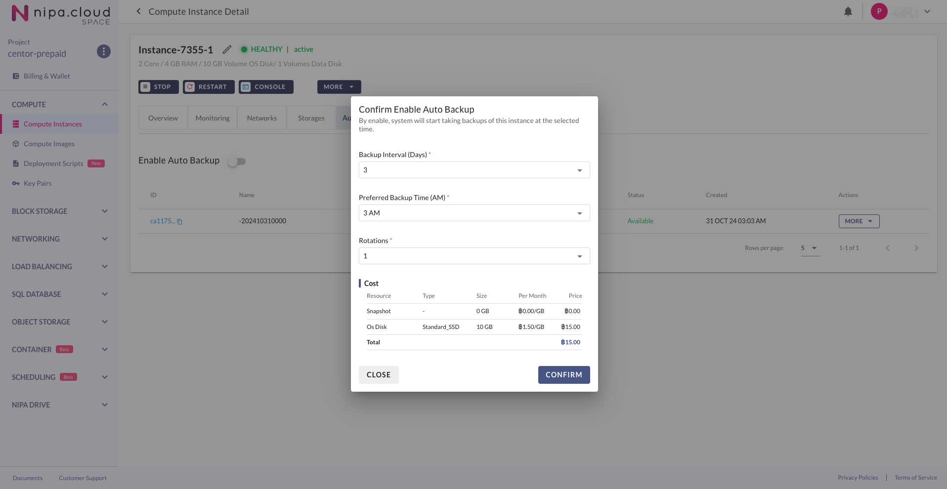 Auto backup allows you to schedule the NIPA Cloud Space system to automatically create snapshots of all Volumes attached to a Compute Instance. You can define the schedule, frequency, and the number of backups to retain.