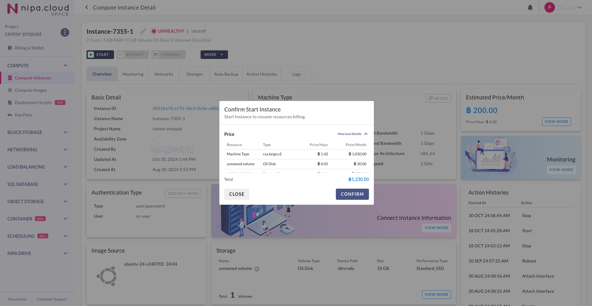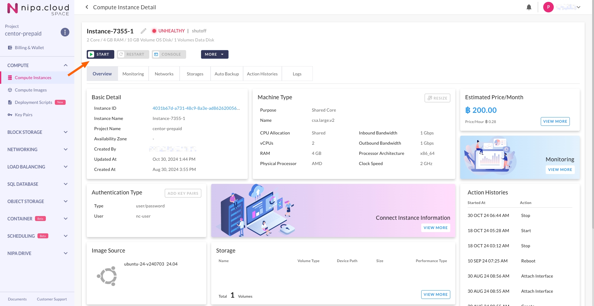 To resume using a Compute Instance that was previously stopped, you can start it by following these steps.