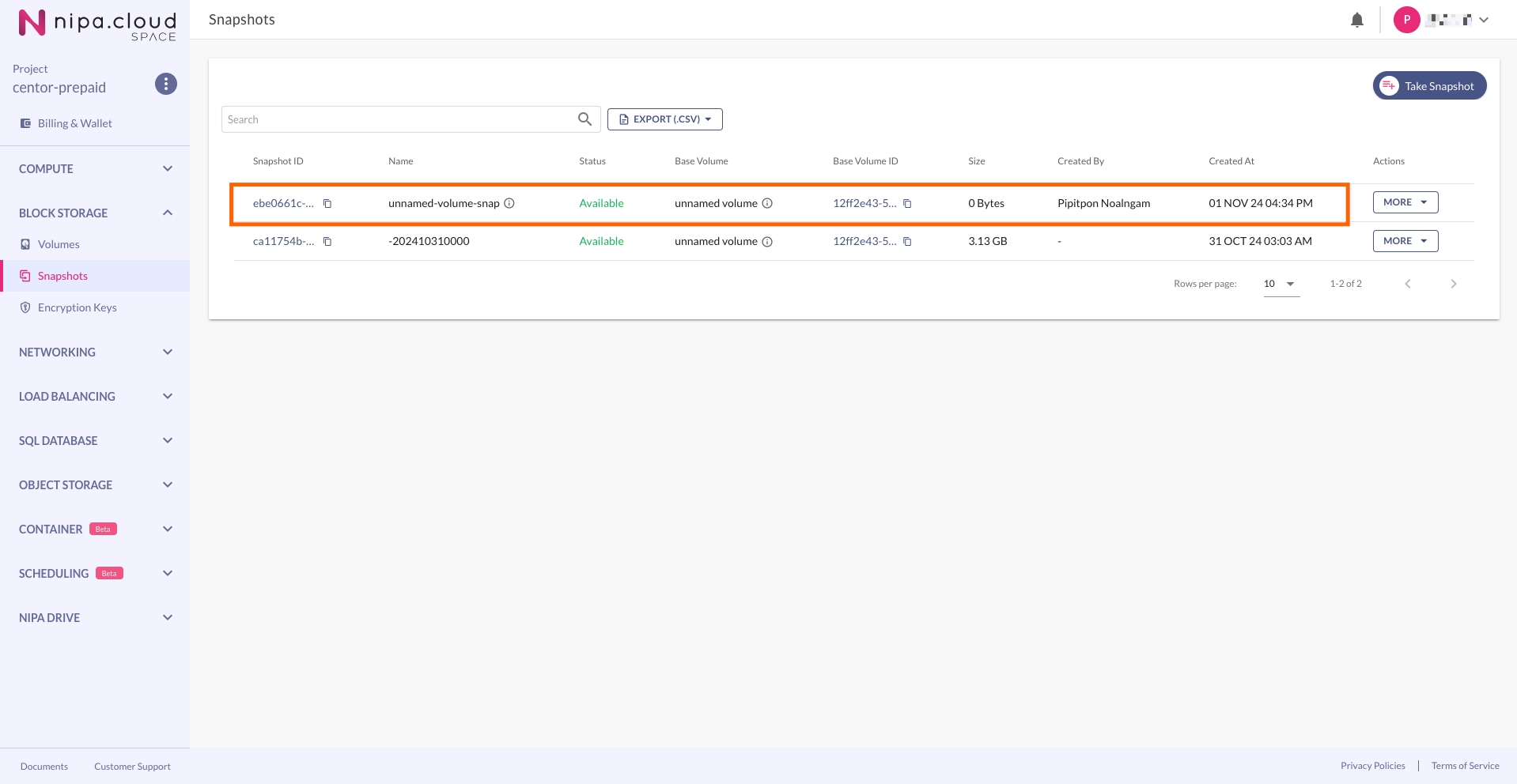 After clicking "CREATE," you will be redirected to the Snapshots list page, where the new snapshot will be displayed. Wait until its status becomes "Available" before using it to create a new Volume.