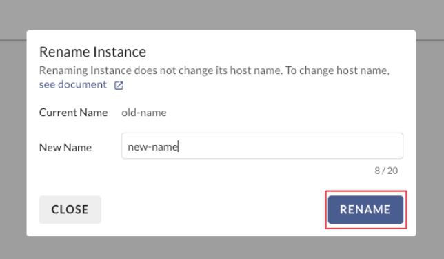 The "Rename Instance" window will appear. Enter the desired display name in the "new name" input field, then click the "rename" button.