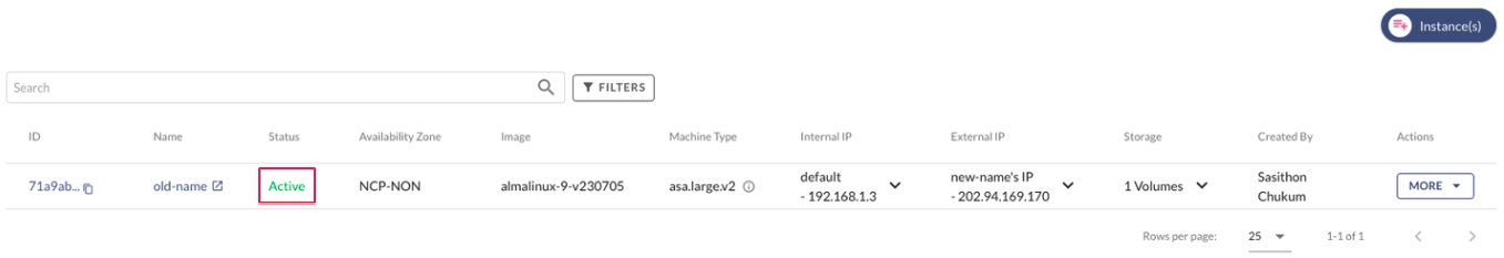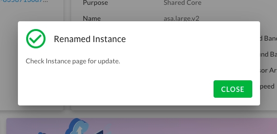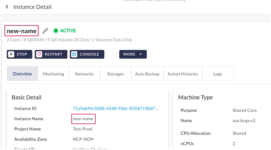 Verify the new display name Upon successful renaming, a "Renamed Instance" notification will appear, and the instance's display name will be updated as requested.