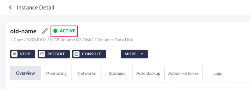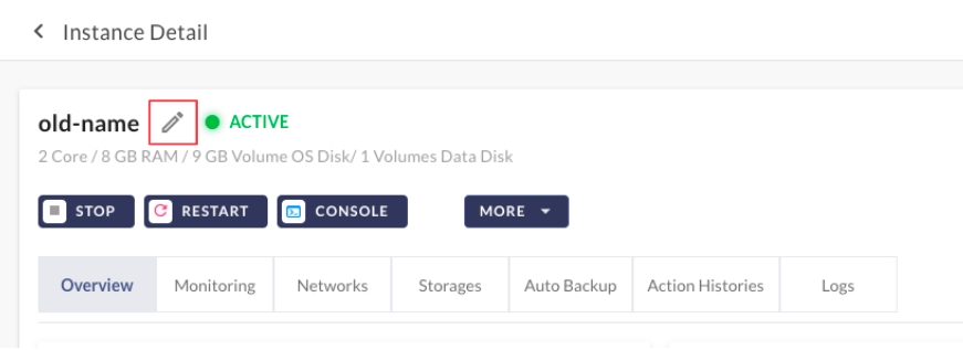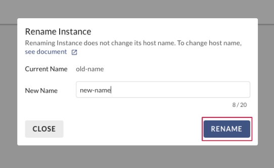 Click MORE > Rename Instance Click the MORE button located under the details section on the instance detail page, and then select the "Rename Instance" menu.