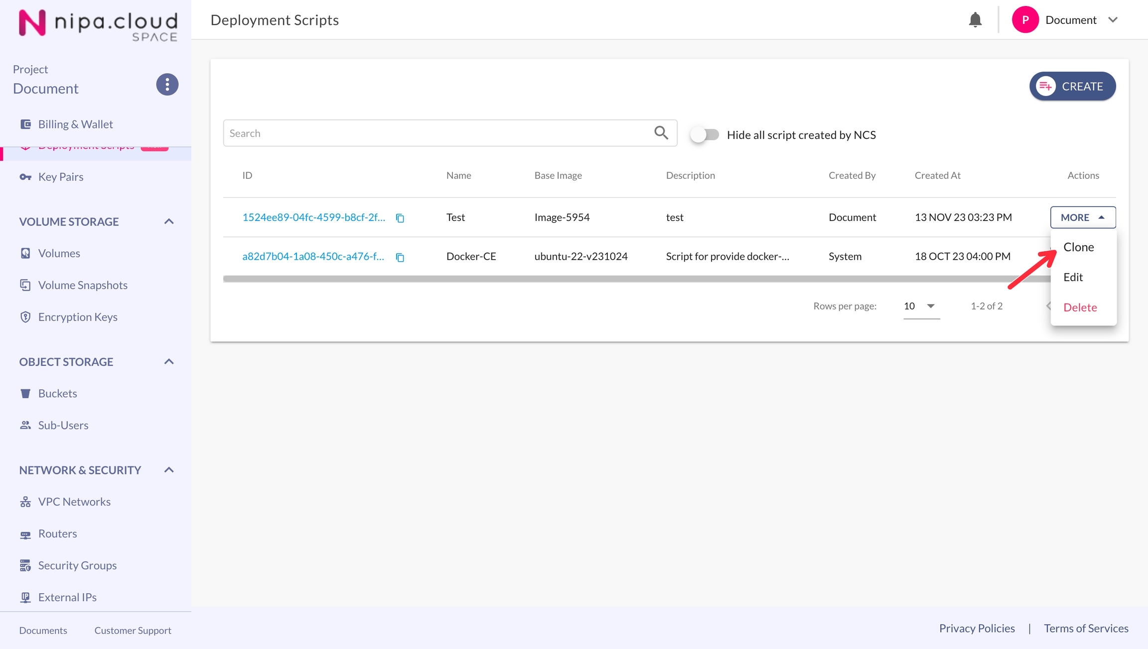 From the deployment script list, select the script you want to clone, then click the MORE > Clone button to open the clone deployment script window.