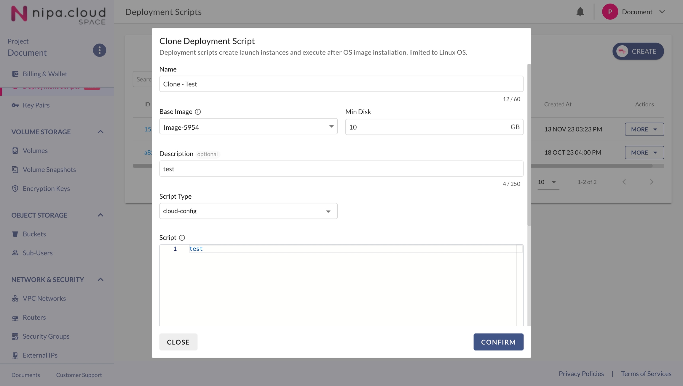 Carefully review all the details you have entered, then click the 'CONFIRM' button to create the deployment script. The newly created script will appear in the deployment script list and as a source option on the launch instance page.