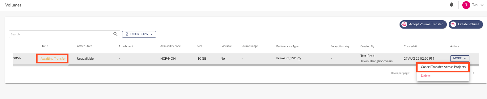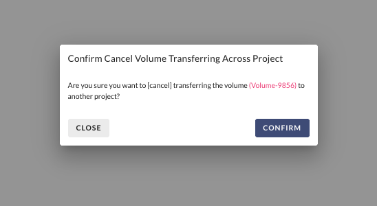 On the Volumes page, select the Volume for which you want to cancel the transfer, then click the **MORE > "Cancel Transfer Across Projects"** button.