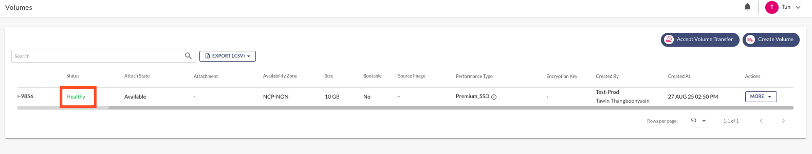 A Volume that has been initiated for transfer but has not yet been accepted by the destination Project will have a status of <mark style="color:yellow;">Awaiting Transfer</mark> and cannot be used during this time.