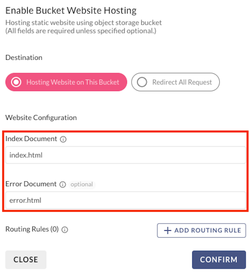 s3cmd put ${OBJECT} s3://${BUCKET_ENDPOINT}/${PATH_TO_FILE} --acl-publics3cmd put index.html s3://test-static-website/ --acl-publics3cmd ls s3://${BUCKET_ENDPOINT}/${PATH_TO_FILE}s3cmd ls s3://test-static-website/2. Configure Static Website Hosting